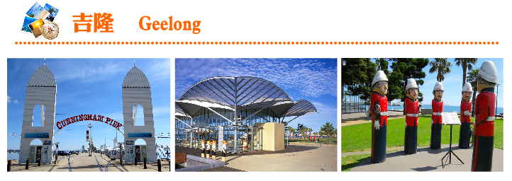 《吉隆Geelong》吉隆背山面海,是墨爾本市郊最大的城市,也是維多利亞州的第二大城,昔日為運送羊毛及小麥到歐洲的主要港口,隨著大郵輪及貨運船的北移,商業活動停滯,卻發展為美食、休閒、玩樂為主的藍海城市,繁華依舊!吉隆的路邊隨處可見許多「木偶樁」,原本為繫船而用,但在地人將平凡的木樁,透過巧手彩繪,成了一尊尊的可愛木偶,像是救生員、觀光客、比基尼女郎、衛兵等等,每一個都非常有特色,也是拍照的絕佳地點。而這樣兼具環保及藝術的概念,讓這座海港活潑了起來,並且也為大洋路這段驚奇的海岸線,揭開了美麗的序曲!
